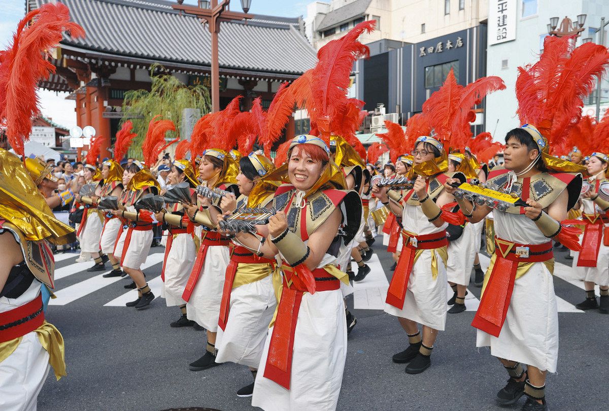 コンテストが5年ぶりに「完全復活」し、東京都台東区浅草の浅草寺周辺で15日に開かれた「第39回浅草サンバカーニバル」。昨年は「縮小版」だったが、今年のコースは以前と同じ800メートルに戻り、「アレゴリア」と呼ばれる山車も登場した。都内を拠点に活動する大学生ら若い世代でつくるチームも、熱い思いを込めた演技で浅草の街を盛り上げた。(鈴木里奈)