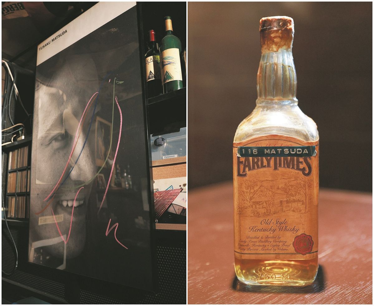 写真左:店の奥にある松田優作さんのポスター写真右:松田優作さんがキープしていたボトル