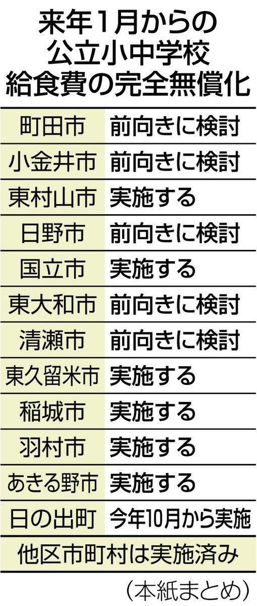 結果は日の出町が今年10月から、東村山、国立、東久留米、稲城、羽村、あきる野の各市が来年1月の3学期から完全無償化を「実施する」と回答。町田、小金井、日野、東大和、清瀬の各市も無償化に向け「前向きに検討する」とした。