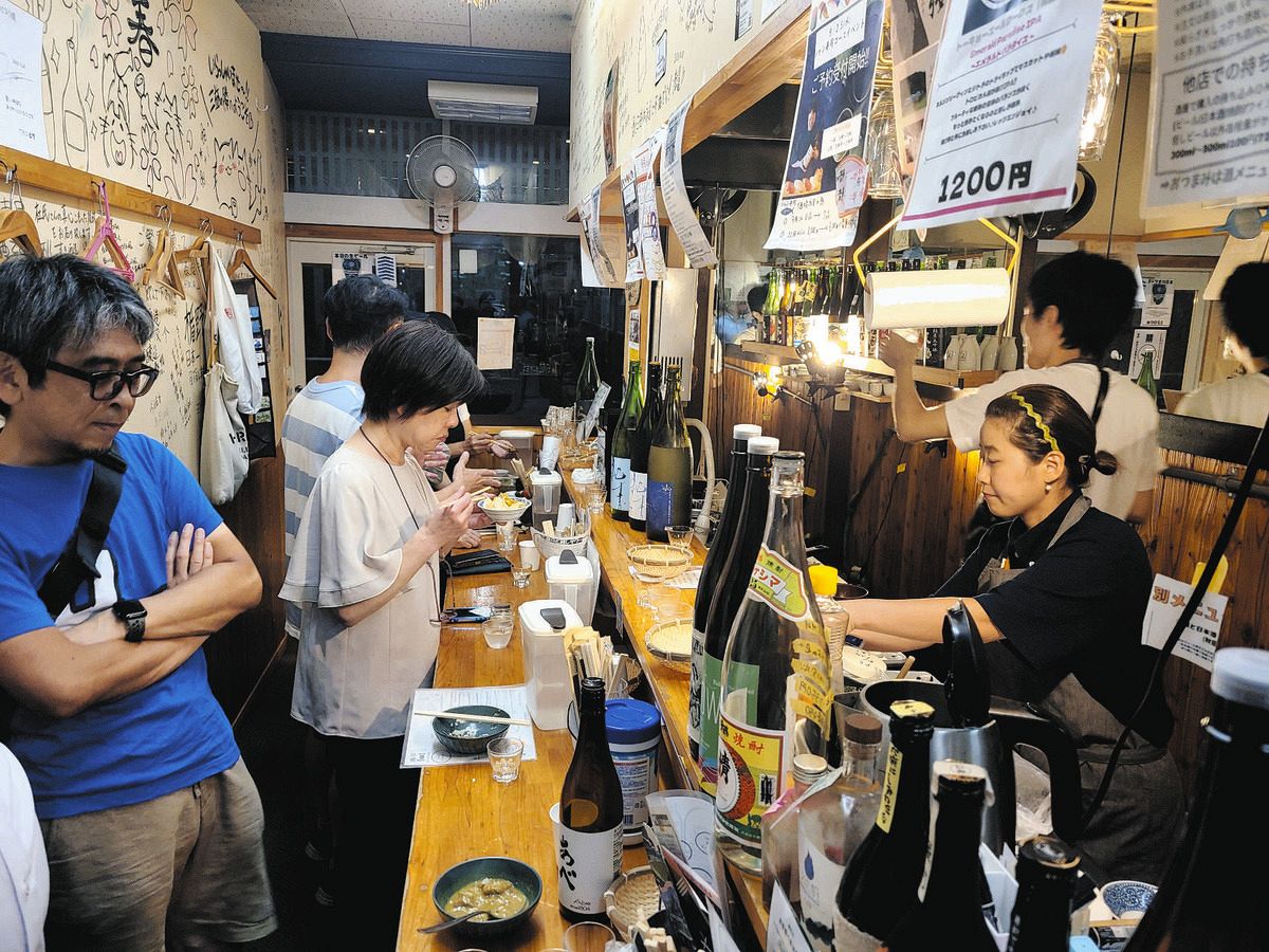 「ここはスーパーで売っていないお酒が飲める」。北区の自営業、上松良憲さん(52)は品ぞろえの良さにひかれ、5年ほど通っている。一緒にわいわい酌み交わすうち、皆知り合いに。ほろ酔いで帰途につく客に、翌日が店の定休日でも「また明日!」と声が飛ぶ明るい雰囲気がリピーターを呼んでいる。