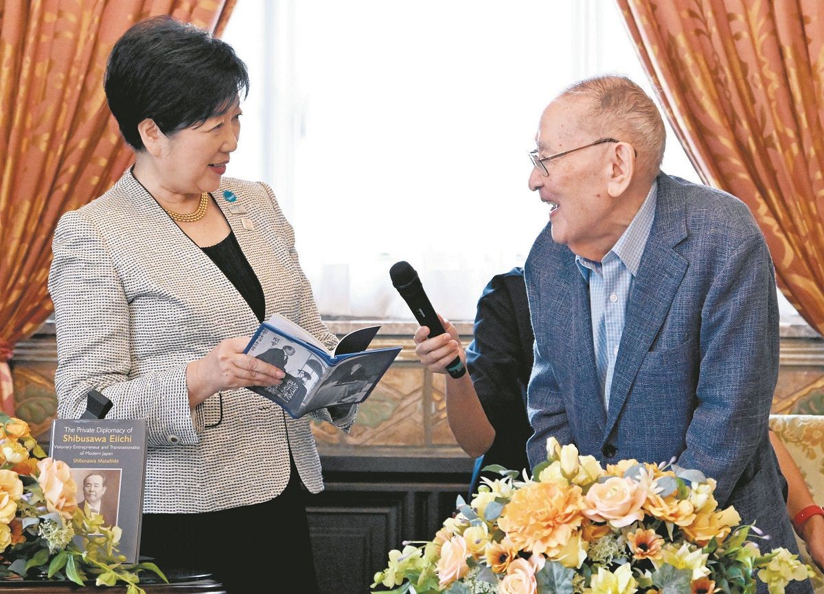 100歳になる東京都内のお年寄りの長寿を祝う都事業で、小池百合子知事が19日、新1万円札に肖像が描かれた渋沢栄一のひ孫、渋沢雅英さん(99)を訪ね、お祝い状や記念品を贈った。栄一が書庫や接客に使った青淵文庫(東京都北区西ケ原)で面会した。