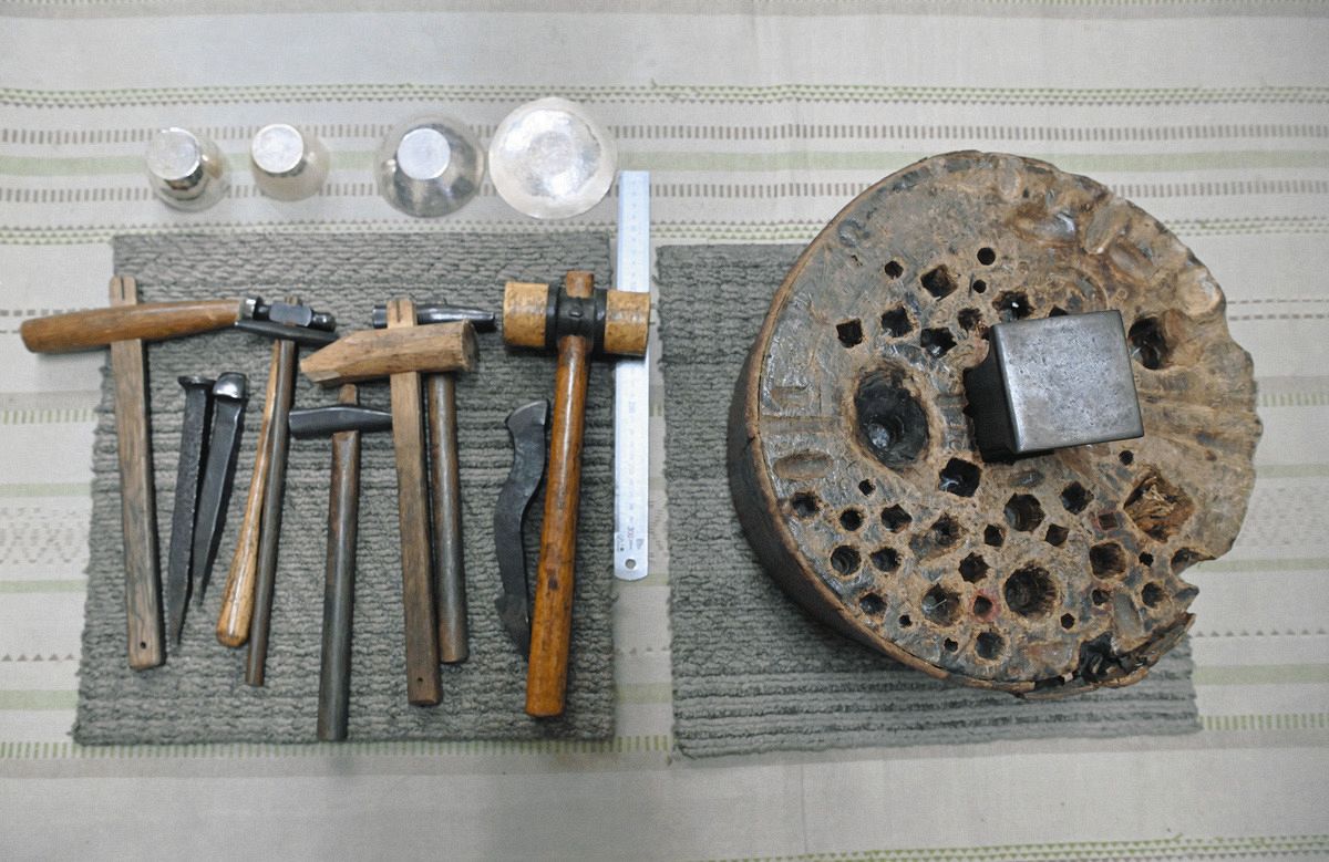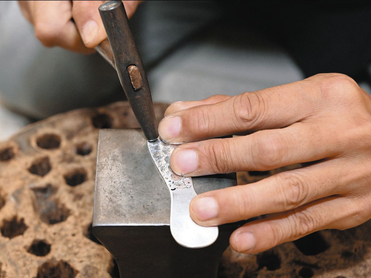 槌(つち)の動きに合わせて、銀製のアイスクリームスプーンに細かな模様が現れる。銀器を成形する「槌絞(つちしぼ)り」、熱を加えて軟らかくする「焼鈍(しょうどん)」に続いて、飾りを入れる「加飾(かしょく)」の工程。「一口に『トン』といっても、いろいろなたたき方があるんですよ」。槌を握る上川さんが教えてくれた。