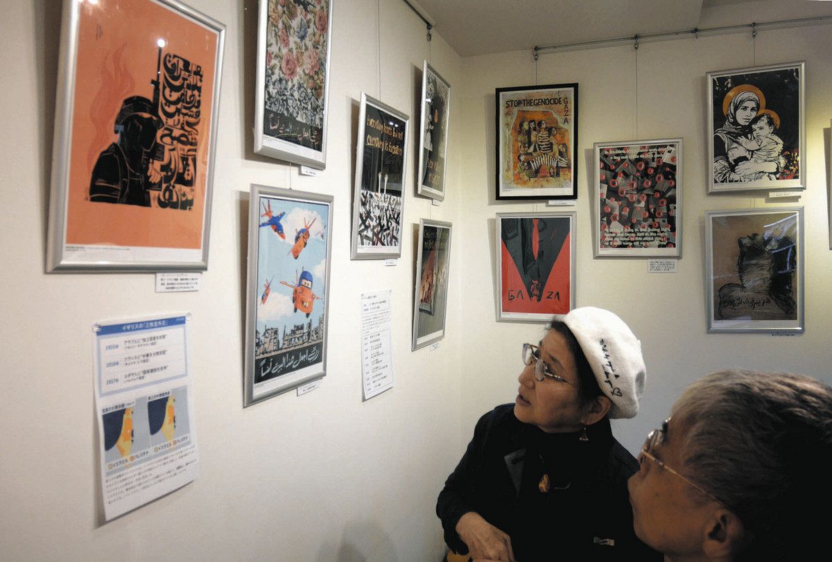 展示しているのは、1~4月にアラブ首長国連邦(UAE)のドバイで開催されたポスター展に出品された作品の一部。パレスチナ文化研究者の長沢美抄子さん(69)が複製を購入した。4月から横浜や池袋など国内各地を回って展示を続けている。