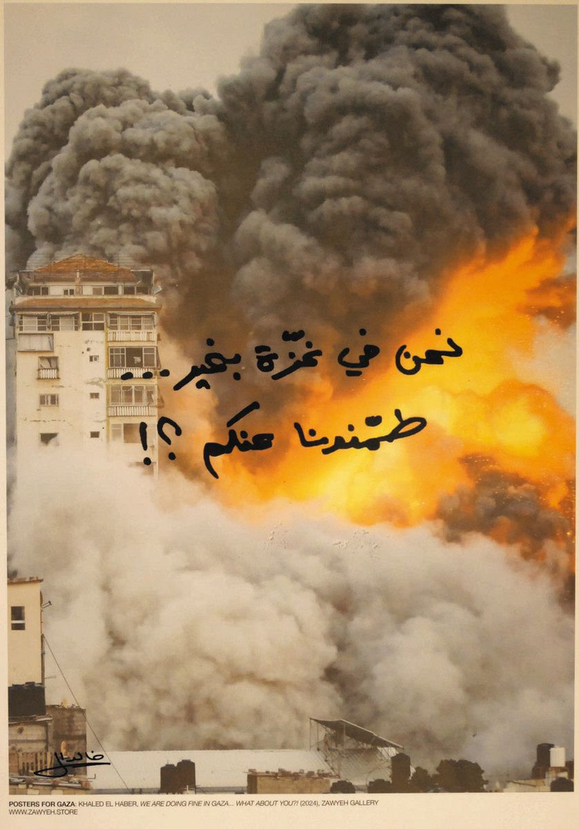 シンガー・ソングライター、ハーレド・エル・ハベルさんの作品は、激しい爆発で破壊されるガザの街の写真の中央に、アラビア語で「僕らは何とかやってるよ。君は?」とのメッセージが記されている。