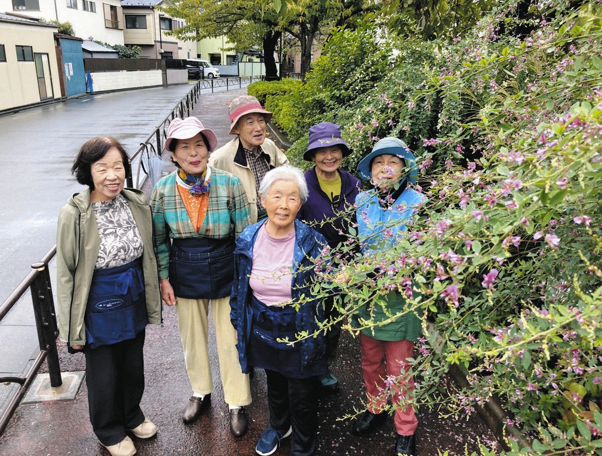 見ごろを迎えたハギの花を見て談笑する「若草会」の皆さん=葛飾区の四つ木公園で