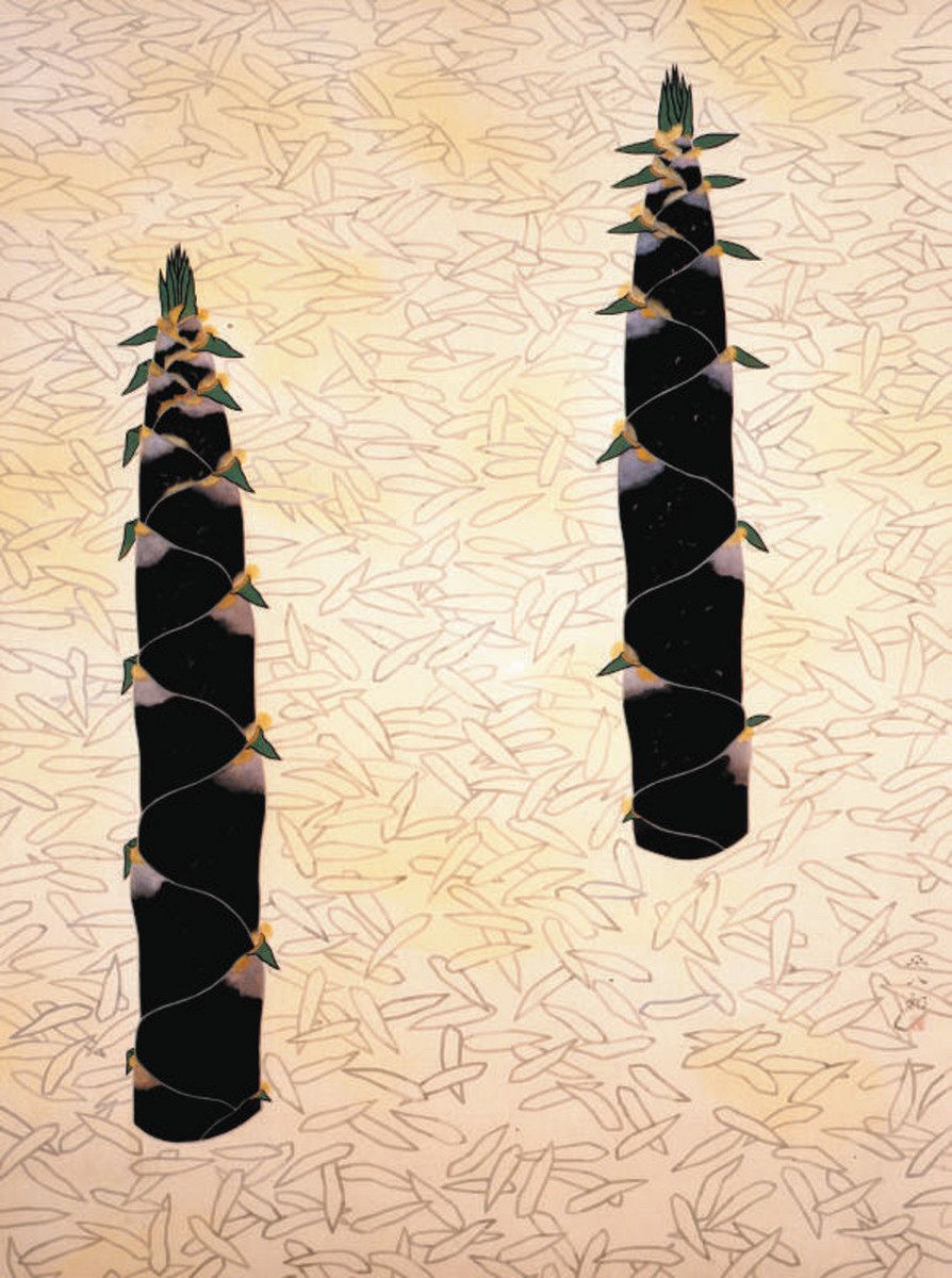 筍の姿は特徴をとらえてリアルな印象だが、それを囲む竹の落ち葉は細かく描き込まれず、背景デザインのよう。周りにあるはずの竹は一切描かれていないが、竹林に差し込む陽光か、落ち葉の上のそこここが、ほわんと黄色くなっている。画家自身が後年、新聞に寄せて「私の絵は、わかりやすく言えば、写実を基本にした装飾画と言えると思います」と述べた通り、本作では写実と装飾が美しく融合している。