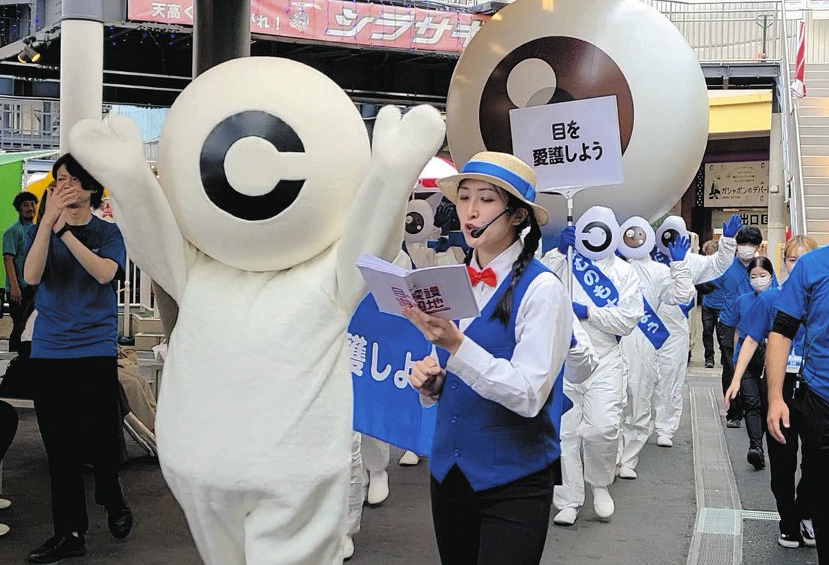 日本最古の遊園地「浅草花やしき」(東京都台東区浅草)に18日、視力検査でおなじみのマーク「ランドルト環」や目のイラストを顔につけた「目の愛護隊」が現れた。愛護隊はメリーゴーラウンドやスワンの形をした船のアトラクションを「ジャック」。目の健康に良いとされるブロッコリーの化身と一緒に園内をパレードし、目を大切にすることを訴えた=写真。