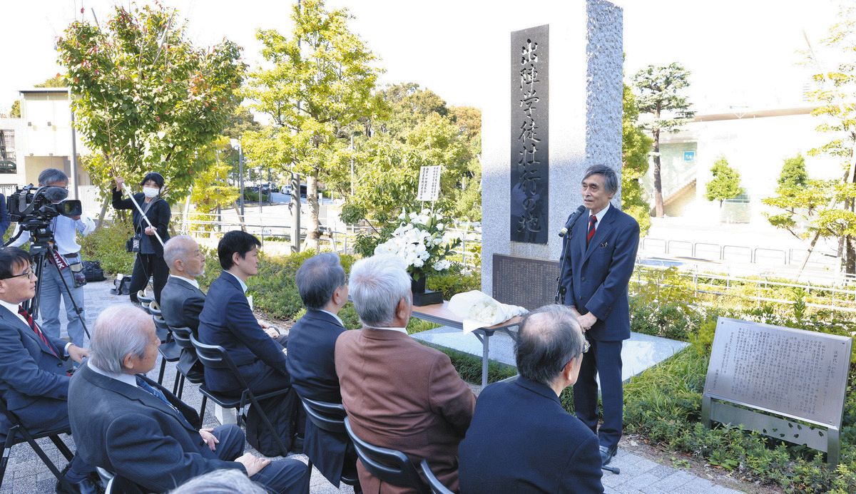 「出陣学徒壮行の地」碑前であいさつする早稲田大学出陣学徒の会・杉浦利重会長=21日、東京都新宿区で(市川和宏撮影)