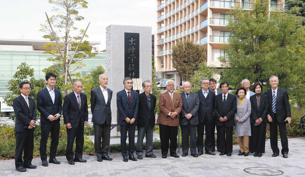 「出陣学徒壮行の地」碑前で記念撮影する参列者=21日、東京都新宿区で(市川和宏撮影)