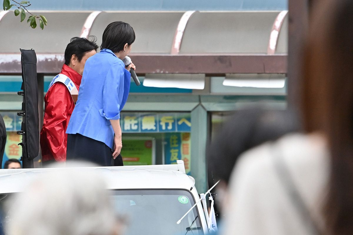 応援弁士とともに街頭演説する候補者=17日、都内で(一部画像処理、中村千春撮影)