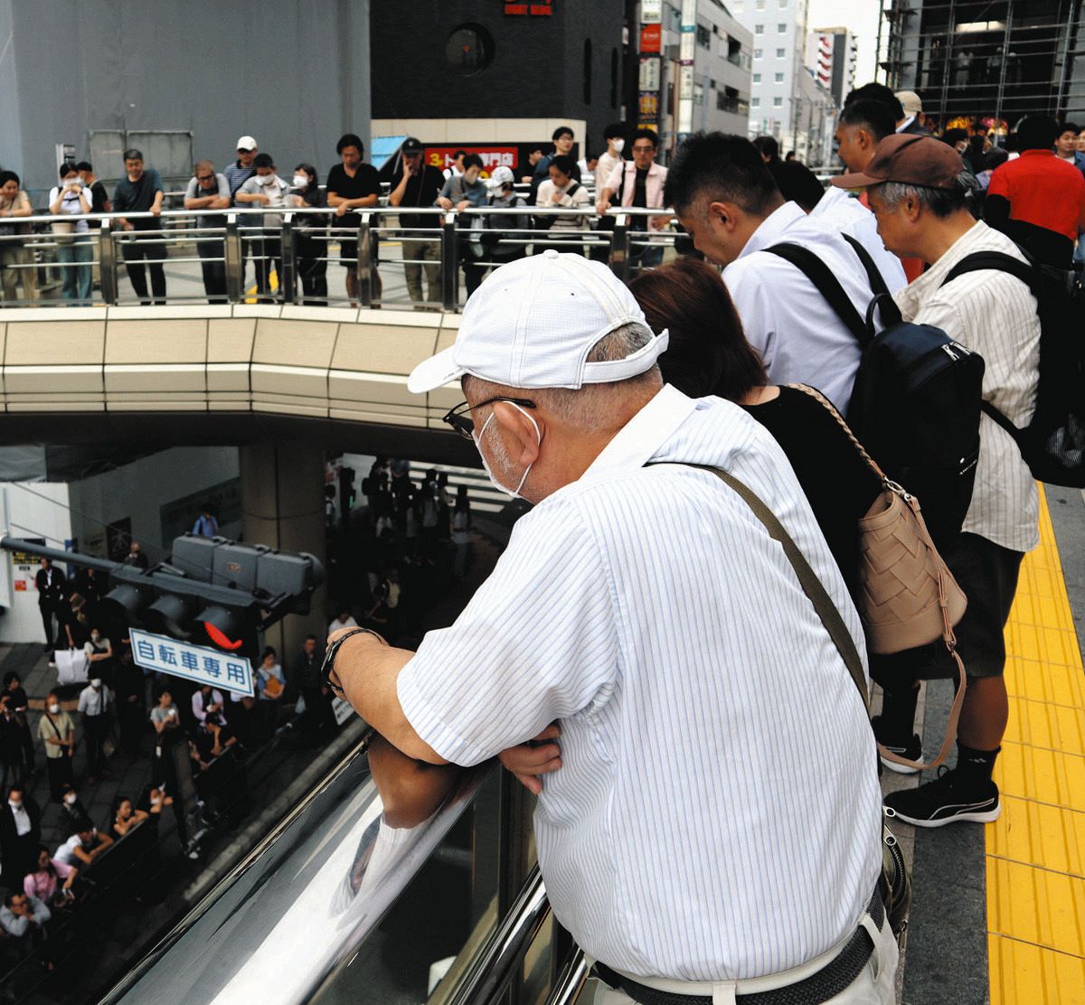 歩行者デッキの上から候補者の演説を聞く人々=東京都八王子市のJR八王子駅前で