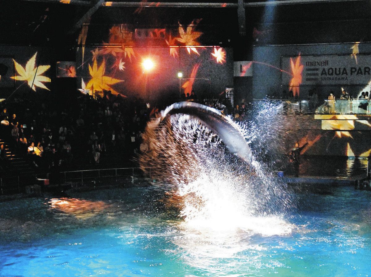 「錦秋の海中庭園」と名付けられた展示スペースで、秋らしい色の魚と、プロジェクターが映す紅葉の渦が競演=写真(上)。人気のイルカショーの会場も夜の部では、投影された紅葉に包まれる=同(下)。