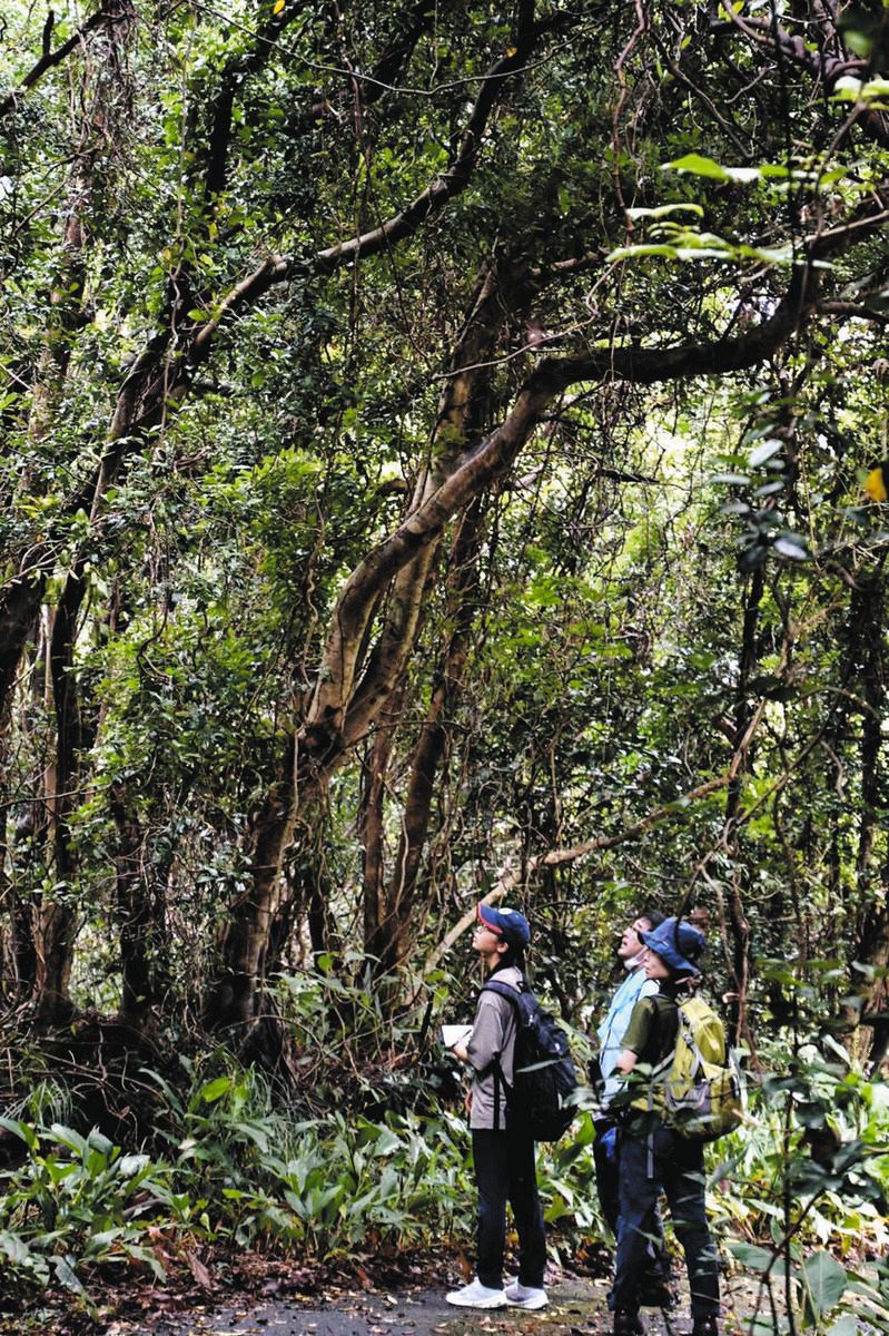 カラスバトを観察する生物部員ら=2022年7月、東京都八丈町で(国光久徳さん撮影)