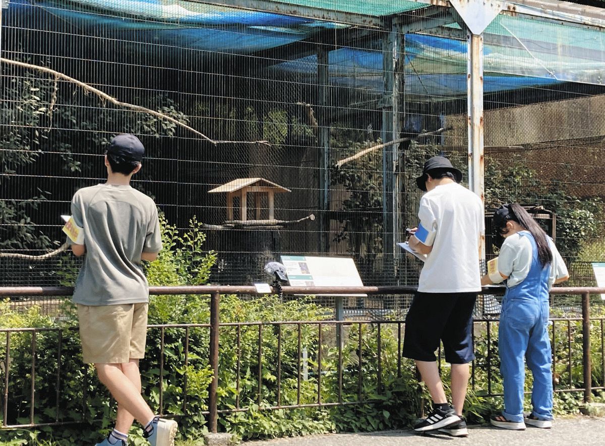 日野市の多摩動物公園のカラスバトを観察し、鳴き声を録音するメンバー=2024年7月、市石博さん撮影