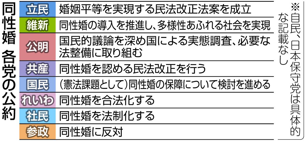 今年3月の札幌高裁判決など、同性カップルの権利保障を国会に求める司法判断が相次ぐ中、衆院選では立憲民主党や共産党などは、同性婚の導入などを公約に盛り込んでいる。一方で、自民党は公約に明記していない。当事者からは「切実な人権問題に向き合う政治を」と声が上がる。(奥野斐)