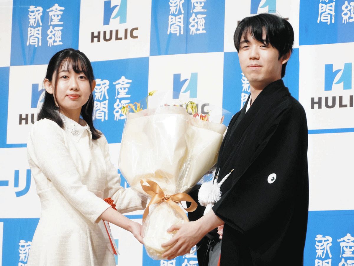 永世称号の獲得を祝し、同じ愛知県出身の脇田菜々子女流初段(27)から花束が手渡されたほか、特別協賛のヒューリックから着物仕立券300万円分も贈られた。