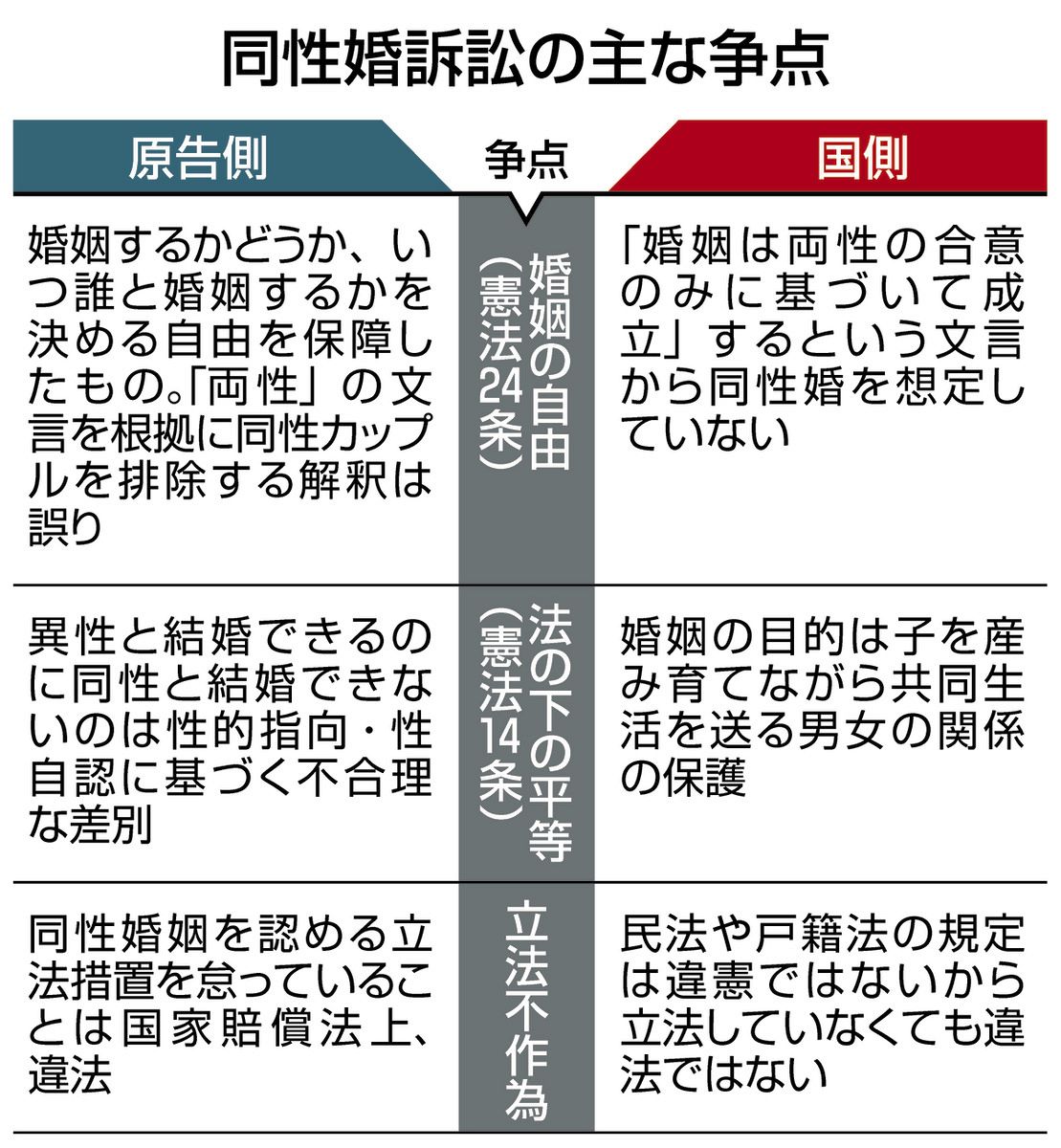 原告側は、別制度は婚姻の代わりにならないどころか「差別の固定化」につながるとして、婚姻の対象に含むよう主張している。