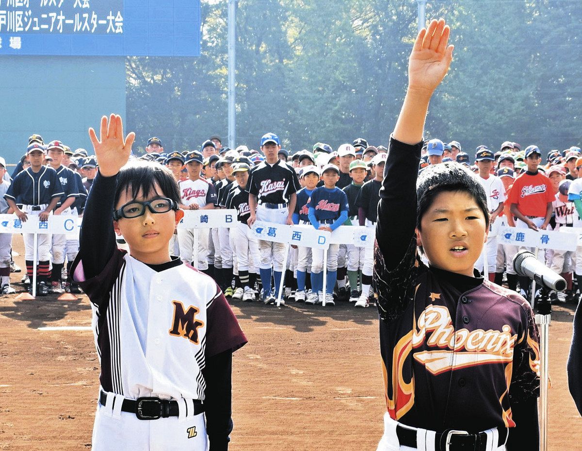 第46回江戸川区オールスター・ジュニアオールスター大会(区学童少年軟式野球連盟主催、東京新聞など協賛)は27日、東京都の江戸川区野球場で開会式があった。オールスター15、ジュニア13の計28チームが出場。オール小岩Bの外山翼主将とジュニアオール篠崎の波多野乃月主将が「少年野球の集大成として、白球に全力で食らいつき、最後まで正々堂々とプレーする」と宣誓した。