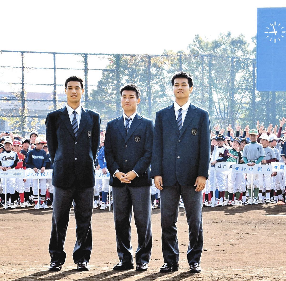 区内の少年野球OBで、今夏の全国高校野球選手権大会で準優勝した関東一高の畠中鉄心、中島幸哉、井田裕士の3選手が甲子園での体験を伝え、後輩たちにエールを送った。