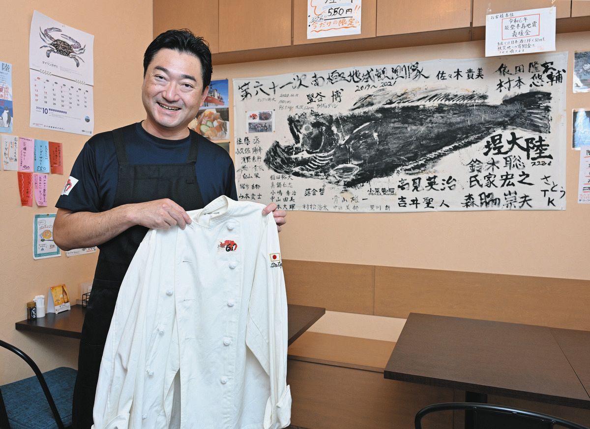 10月中旬に行われた企画展の開会式で、竪谷さんはこの魚の煮付けを関係者に出した。「くせのない白身。南極のは大きくて料理するのに苦労した。真ん中で二つに切り、丸焼きにした」。竪谷さんは現在、杉並区西荻北で居酒屋を経営しており、店内に南極での2020年12月の釣果(全長150センチ、重さ46.5キロ)の魚拓を飾っている。