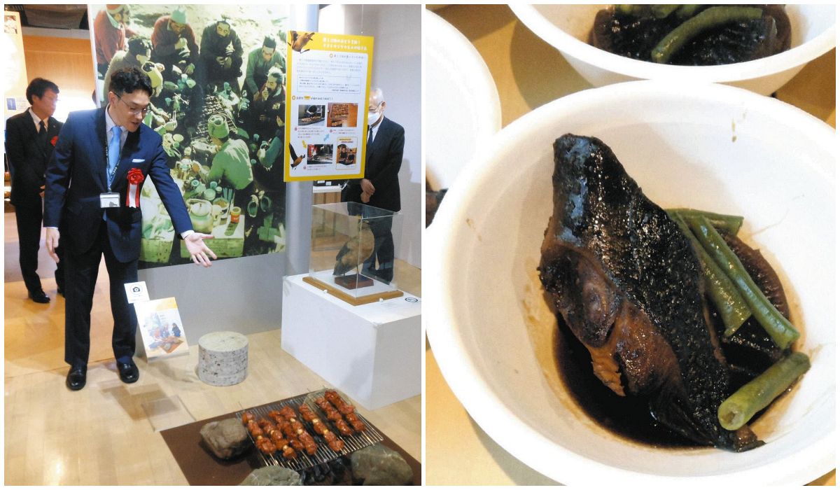 ㊧再現した「オオトウゾクカモメの焼き鳥」について説明する田留健介さん、㊨開会式で竪谷博さんが作ったライギョダマシの煮付け=いずれも世田谷区の「食と農」の博物館で