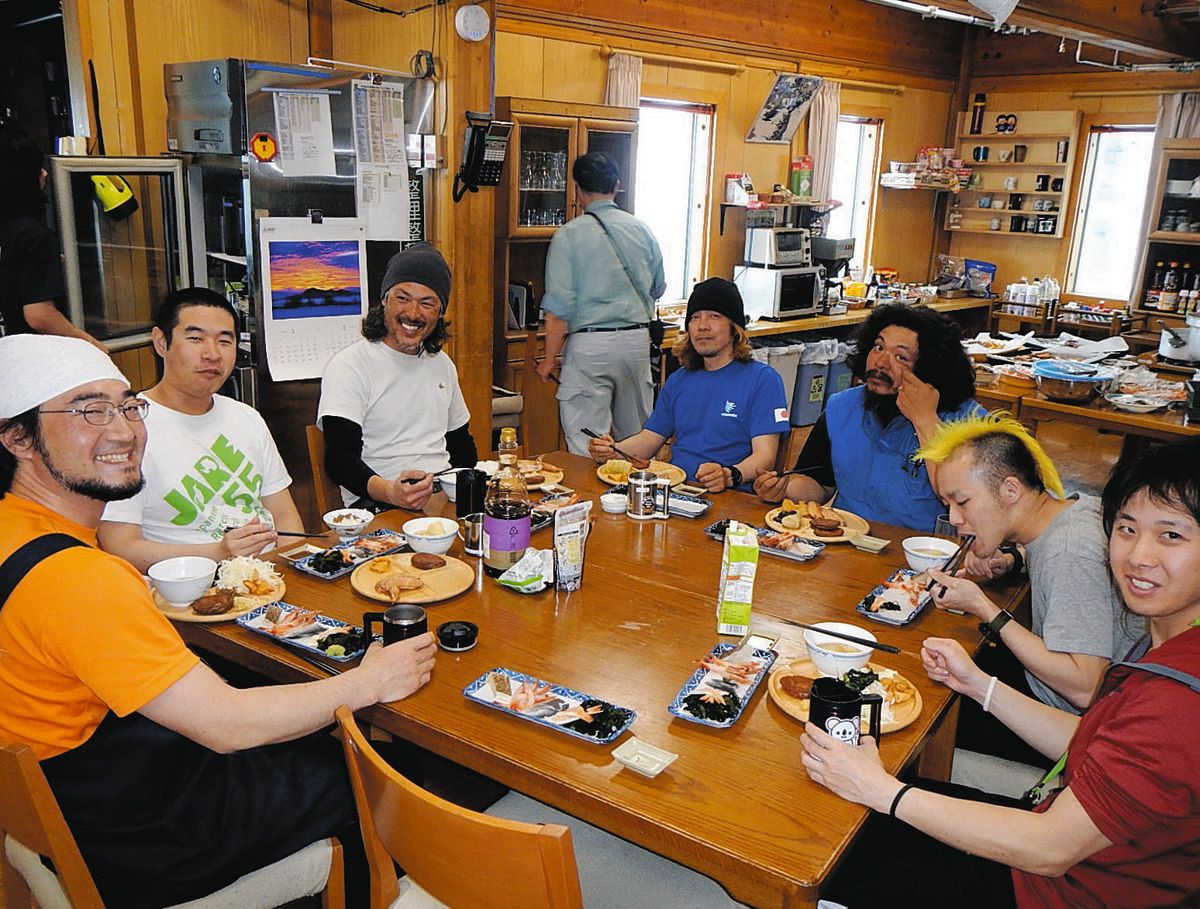 第55次隊員の食事の様子。左端が竪谷博さん=2015年1月、南極・昭和基地で(国立極地研究所提供)