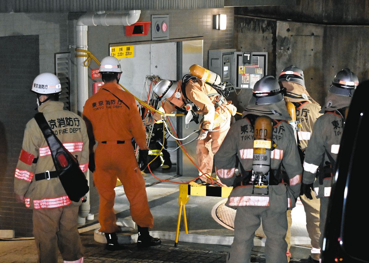 作業員が一時閉じ込められたマンションの、地下駐車場の入口付近を調べる消防隊員ら=2021年4月、東京都新宿区で