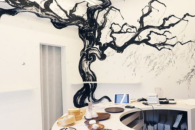 ガラス張りの店内は白を基調とし、水墨画アーティストのCHiNPANさんが伸びやかに描いた巨木が圧巻。季節ごとに変わる絵柄にも要注目。