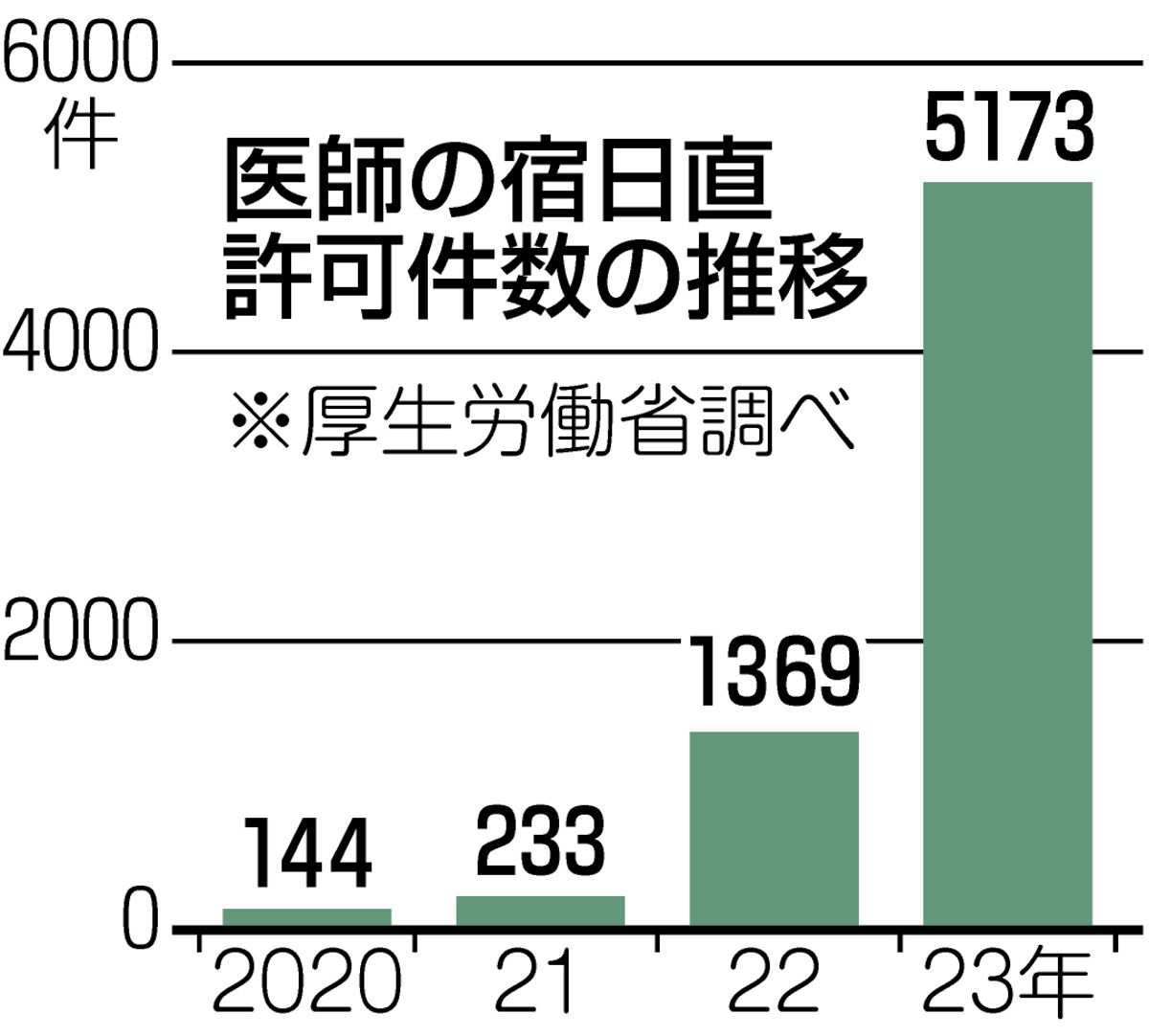 2020年に144だった宿日直許可の件数は、労働時間が規制される直前の2023年に5173件と3年で約36倍となった。厚生労働省の担当者は「規制を前に導入が広がった」とする。同省は規制前に宿日直許可の解説や相談などを行っており、急増の一因となった。