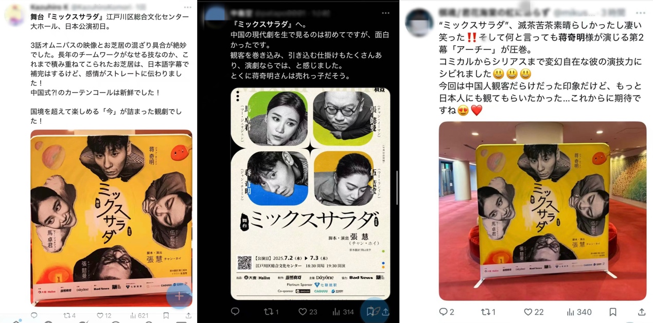 今回の東京公演では、日本の要素を取り入れたほか、特別に日本語字幕を追加し、第3話のマルチメディアデザインには日本語表現が織り込まれました。2回の公演を経て、日本の観客はこの創造力に満ちた中国の物語に深く感動しました。「3話オムニバスの映像とお芝居の混ざり具合が絶妙でした。長年のチームワークがなせる技なのか、これまでで積み重ねてこられたお芝居は、日本語字幕で補完はするけど、感情がストレートに伝わりました!中国式?!のカーテンコールは新鮮でした!国境を超えて楽しめる「今」が詰まった観劇でした!。」「中国の現代劇を生で見るのは初めてですが、面白かったです。観客を巻き込み、引き込む仕掛けもたくさんあり、演劇ならでは、と感じました。」「"ミックスサラダ", 涙茶苦茶素晴らしかったし笑い笑った!!そして何と言っても蒋奇明様が演じる第2幕「アーチー」が圧巻。コミカルからシリアスまで変幻自在な彼の演技力にシビれました。」