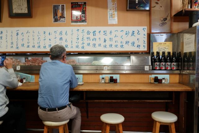 「鳥竹総本店」の1階。カウンターにおひとり様のお客様が並んでいて、思い思いに昼飲みを楽しんでいる。