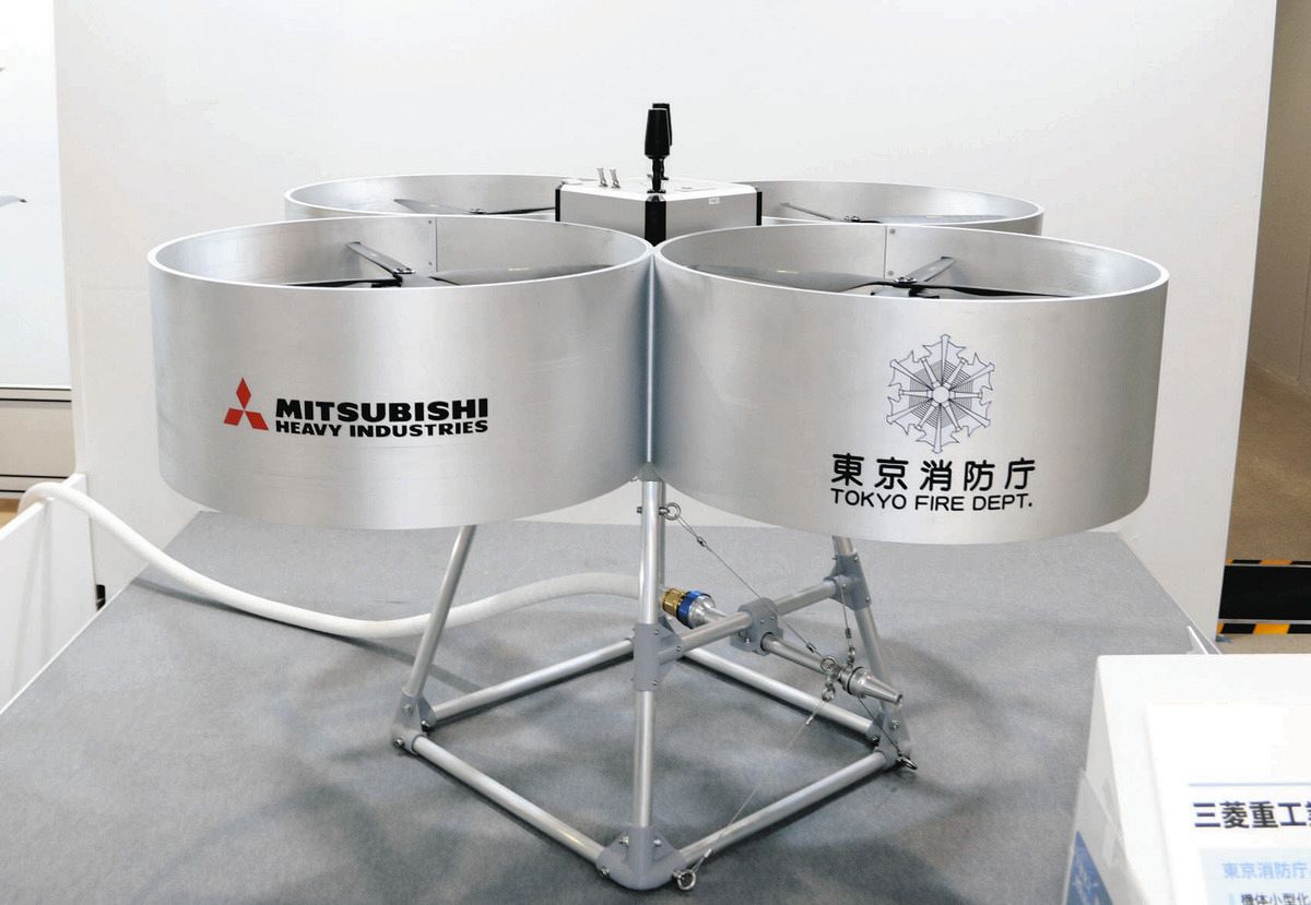 10月3日、東京ビッグサイト(東京都江東区)で開かれていた産業展の一角に、銀色に輝くドローンが初披露された。東京消防庁が本年度に2億4000万円を投じて三菱重工業と共同開発する消火活動用ドローン。高さ1.1メートル、幅、奥行き1.4メートル。20メートル以上の高さまで飛行できる。上部のプロペラを円筒の耐熱樹脂が覆い、下部に放水用の部品が取り付けられていた。部品を切り替えれば消火用の薬剤を投てきできる。
