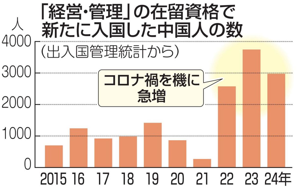 実際、出入国在留管理庁の統計を見ると、経営・管理ビザで新たに在留資格を得て入国した中国人の数は、コロナ禍を機に急増している。2023年は3700人を超え、過去最多となった。