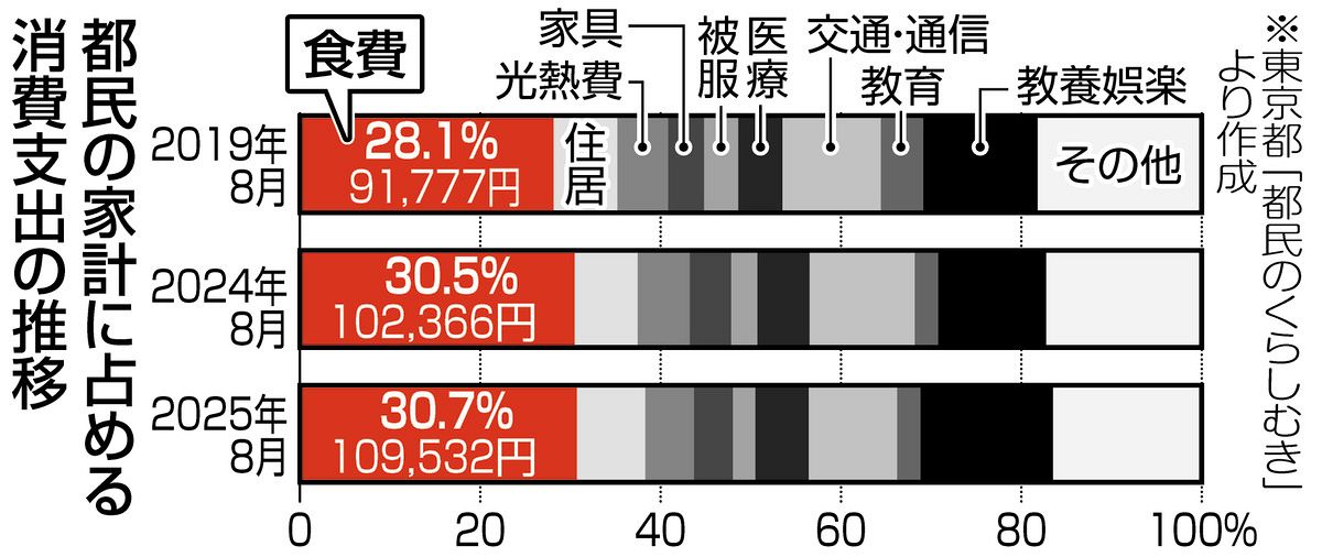統計では、支出内訳を「住居」「光熱・水道」など10項目で示す。最多は支出の約3割を占めた「食料」で、10万9532円(前年同月比7.0%増)だった。