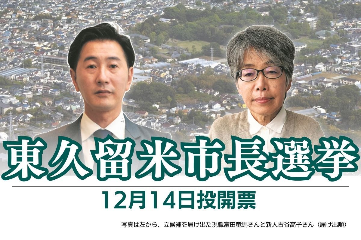 東京都東久留米市長選は7日、告示され、いずれも無所属の現職富田竜馬さん(48)=自民、公明推薦=と、新人で市民団体役員の古谷高子さん(67)の2人が立候補を届け出た。