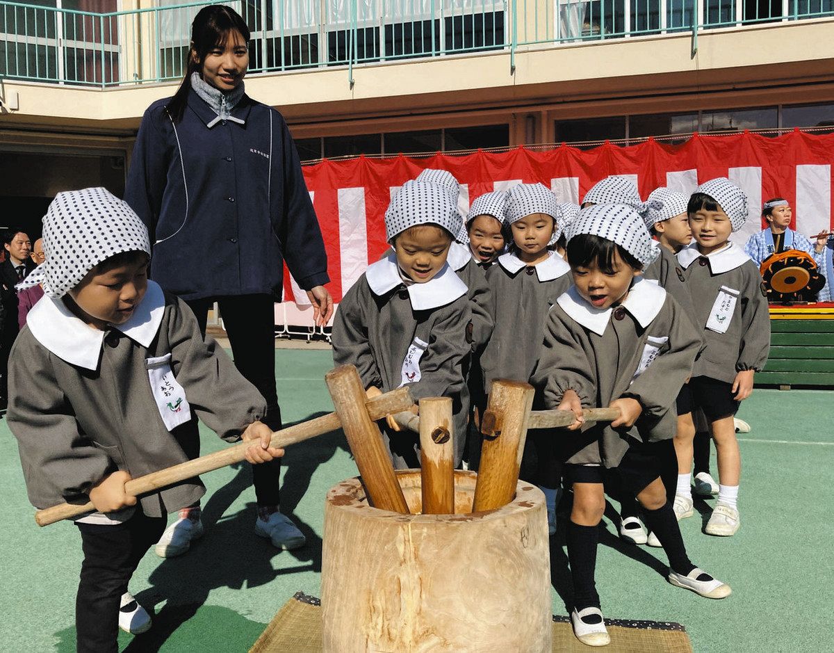 東京都台東区の浅草寺幼稚園(浅草2)で9日、園児たちによる餅つきがあった。1946(昭和21)年ごろから毎年続く園の恒例行事。多くの観光客でにぎわう年の瀬の仲見世商店街に面した園内では、子どもたちの元気な声が響いた。