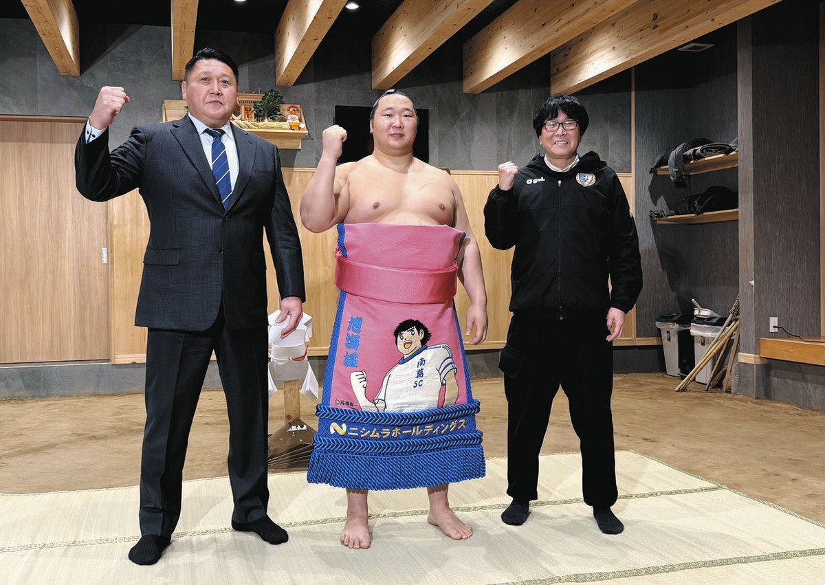 11日に初日を迎える大相撲初場所に新十両として臨む大島部屋(東京都葛飾区青戸7)の旭海雄(きょくかいゆう)関に、漫画「キャプテン翼」の主人公・大空翼を描いた化粧まわしがプレゼントされた。デザインを監修した同区出身の作者・高橋陽一さんは「翼くんが土俵に上がるとは」と笑顔を見せた。