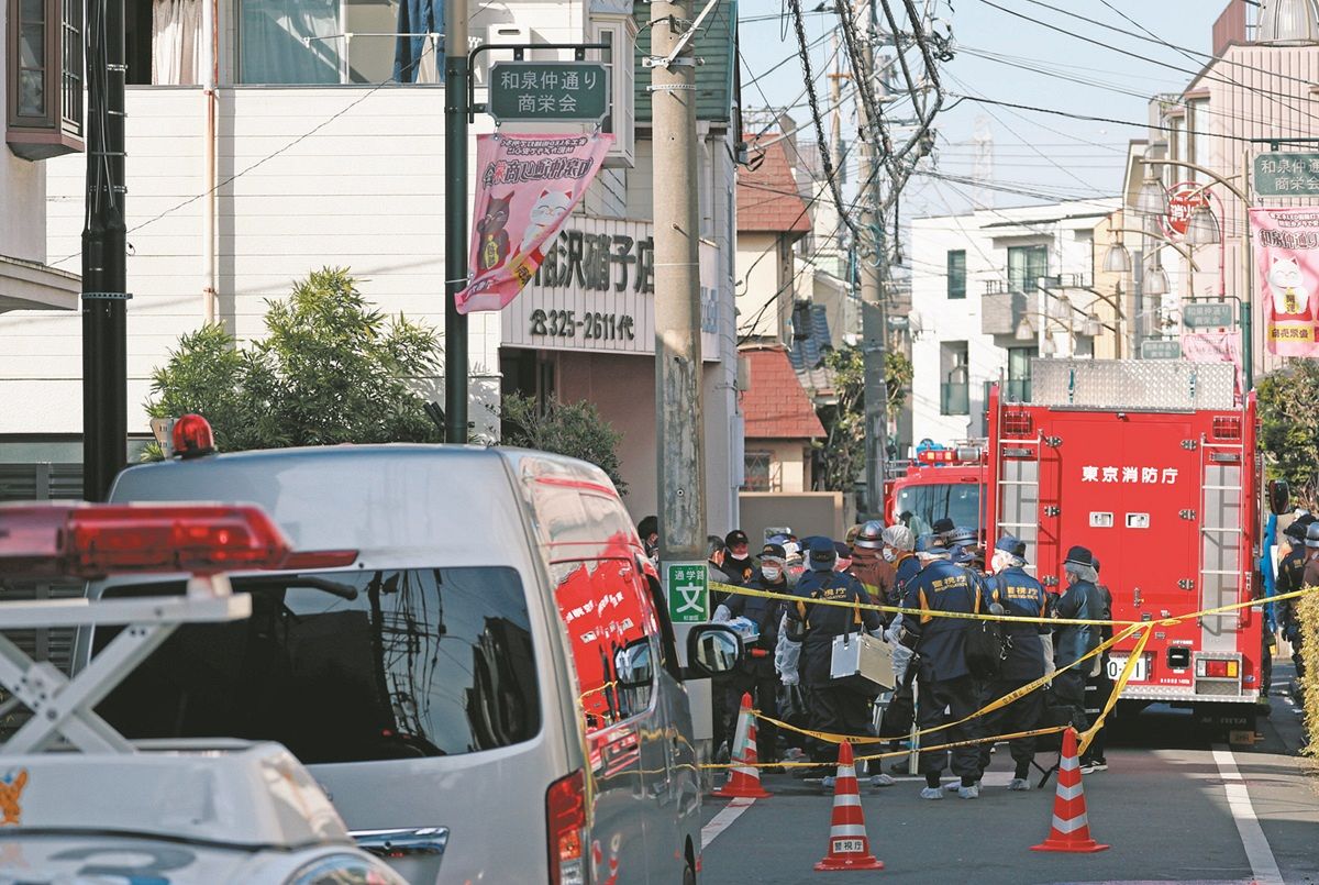 警察官や消防隊員が行き交う現場付近=東京都杉並区で(平野皓士朗撮影)