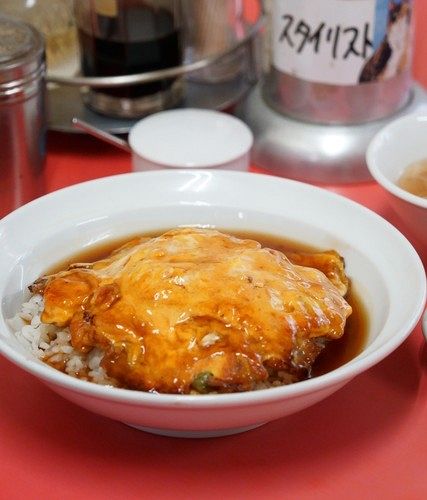 そのメニューが何かはわからないが、僕は「天津丼」を目当てにしてきた。ネット画像で眺めたこの店の天津丼が気に入ったのだが、玉子の上に茶色っぽい甘酢味と思しきタレがまぶされたオーソドックスなタイプだ。