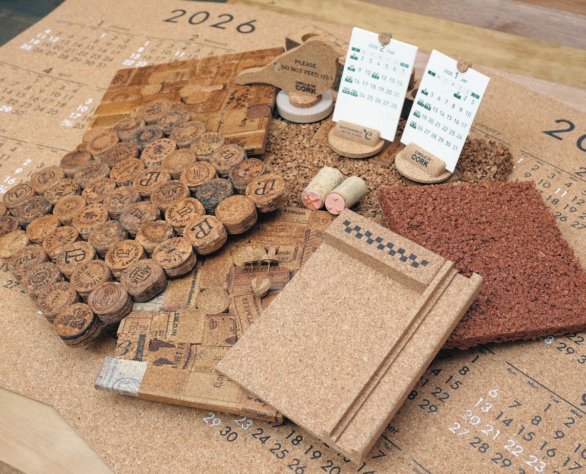 コルクで作られたカレンダーや内装材、舗装材などの製品=墨田区で(木戸佑撮影)
