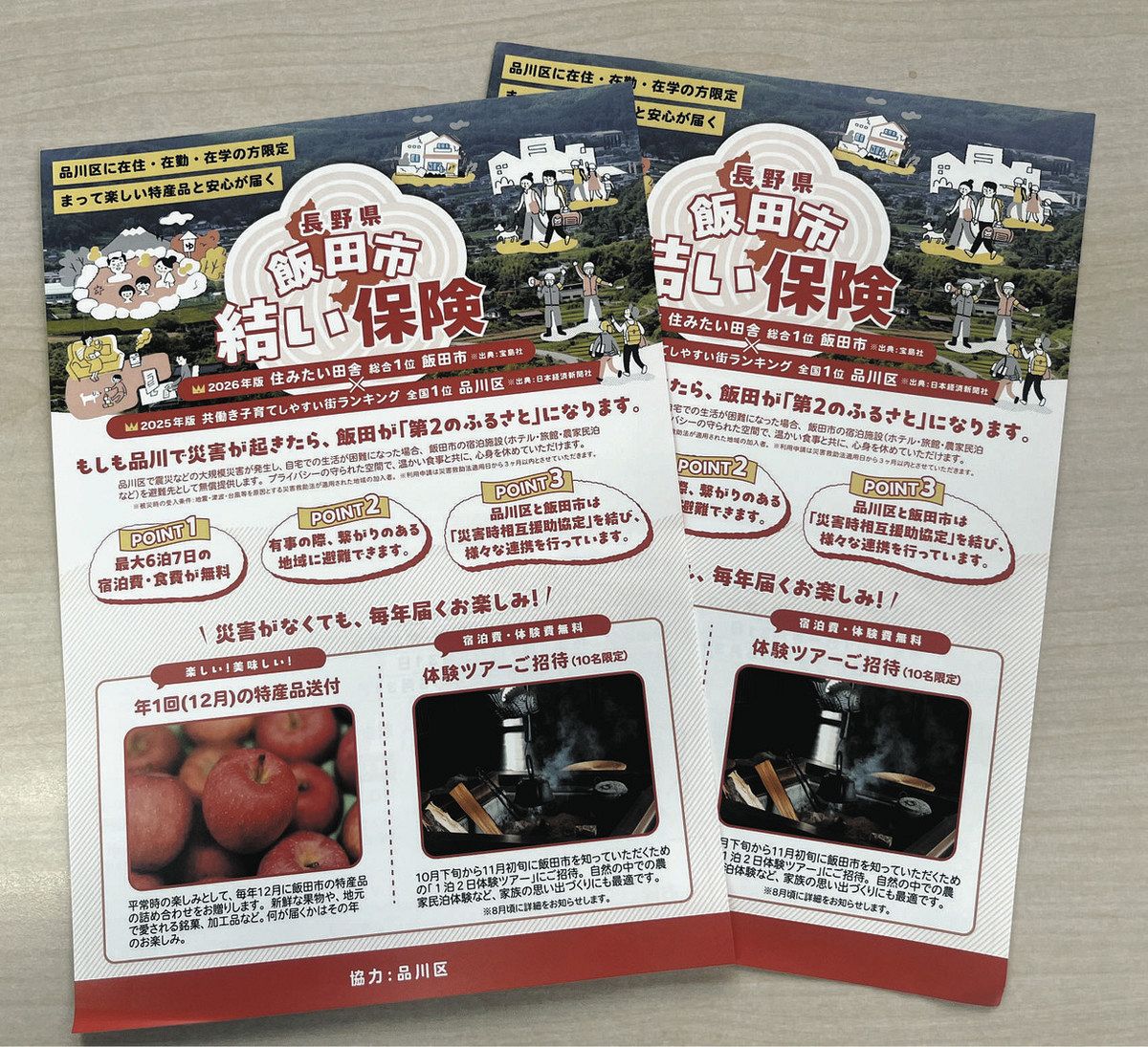 東京都品川区と交流する長野県飯田市は、大規模災害で被災した区民らが、市内のホテルや農家民泊などに最長6泊7日、無料で避難できる制度「結い保険」をつくった。同市を区民の「第2の古里」として交流促進にもつなげる試み。